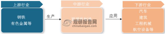 紧固件行业产业链上游产业是紧固件基础原材料,主要是钢铁、有色金属等,下游是紧固件应用领域,包括汽车、建筑、工程机械、航空设备等行业。