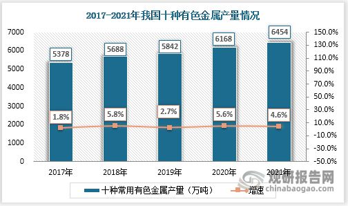 有色金属是经济、科技、国防建设等发展的关键性基础物质,在社会中的地位越来越重要。我国有色金属行业生产平稳运行,发展持续向好,2017-2021年我国十种有色金属产量呈稳中上涨趋势;2020年产量突破6000万吨,2021年产量同比增长4.6%,达到6454万吨。随着国内稳增长政策落地生效叠加社会各界投资向实体经济倾斜,有色金属行业韧性弹性凸显。