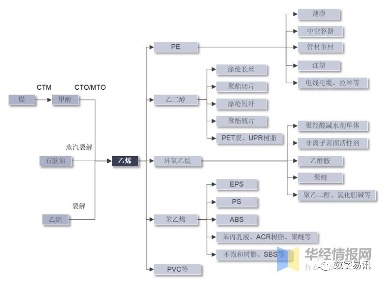 乙烯生产工艺流程可分为三类:煤制烯烃(CTO/MTO)、石脑油蒸汽裂解、乙烷裂解。乙烯下游产品包括聚乙烯(PE)、乙二醇、环氧乙烯、苯乙烯、聚氯乙烯(PVC)等,这些衍生物的主要下游产品有塑料、纤维、橡胶等合成材料以及表面活性剂、黏合剂、涂料等,终应用于包装、农业、建筑、电子电器、机械和汽车等行业。