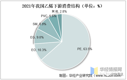 我国乙烯工业已逐步进入成熟期,下游衍生物主要有PE、环氧乙烷(EO)、EG、SM、聚氯乙烯(PVC)等产品。五类产品共占乙烯总消费量约97.2%。其中,最大消费领域是PE,占总消费量的63.5%。其次是EO和EG,分别占10.3%和9.0%。