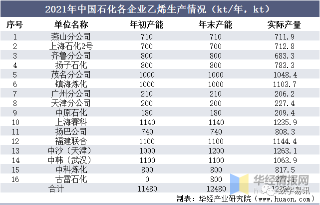 2021年中国石化各企业乙烯生产情况(kt/年,kt)