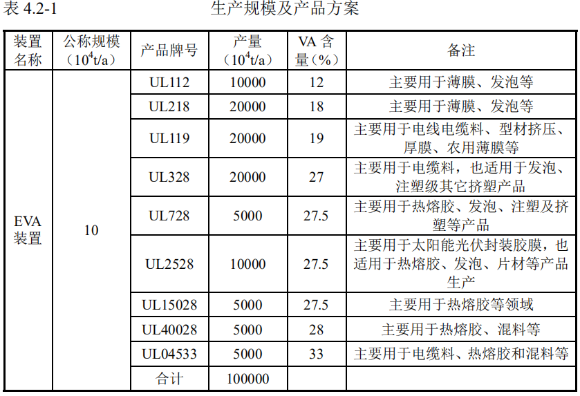 本项目EVA装置设计规模10万吨/年,年操作时间8000小时,操作弹性:60-110%。产品方案包括 UL112、UL218等9个牌号的 EVA 产品。产品方案见下表。
